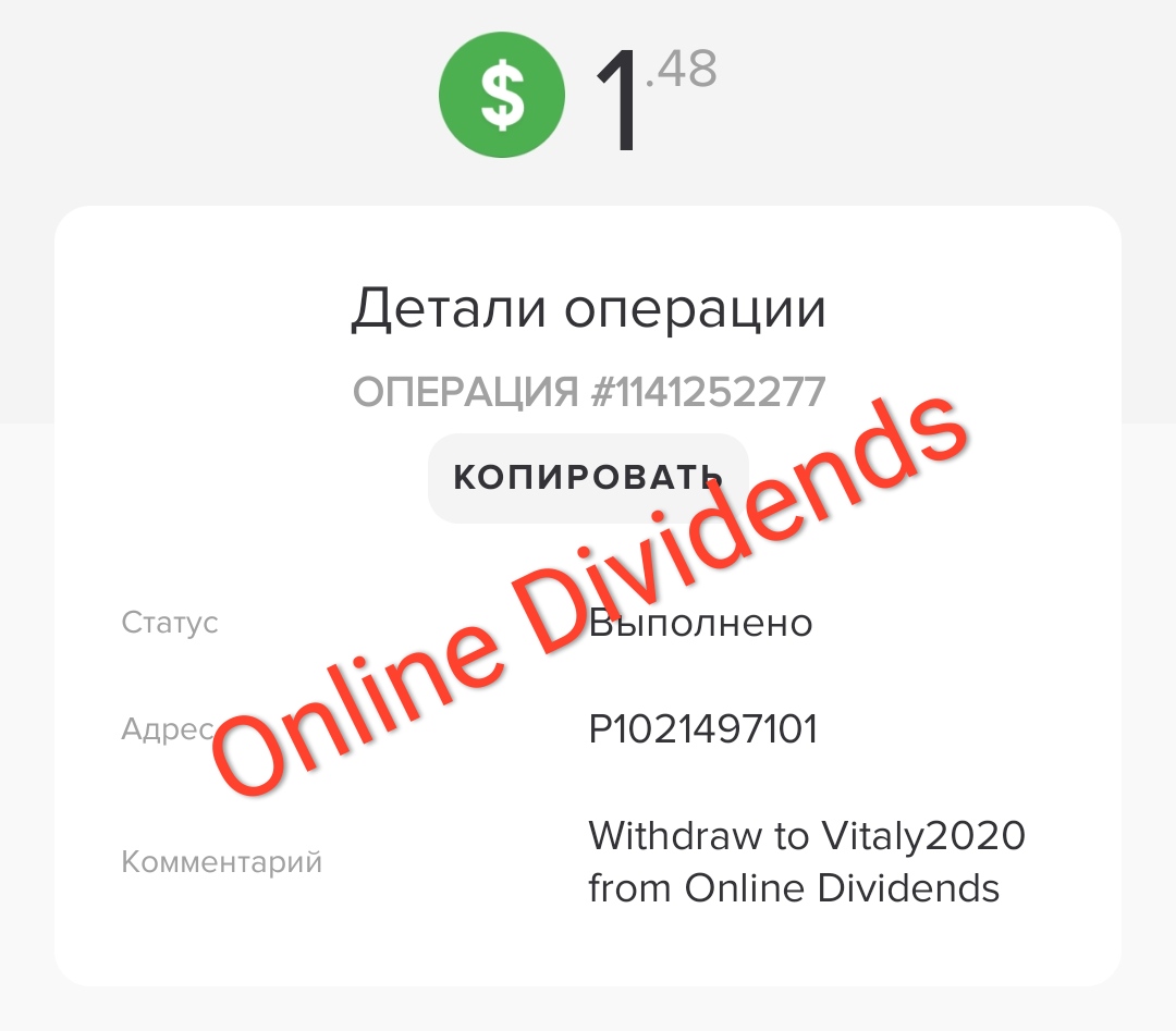 ONLINEDIVIDENDS.COM +0.1 50.5 Received Payment 0.1 USD from account U21921555. Memo: API Payment. Withdraw to covboi from Online Dividends.