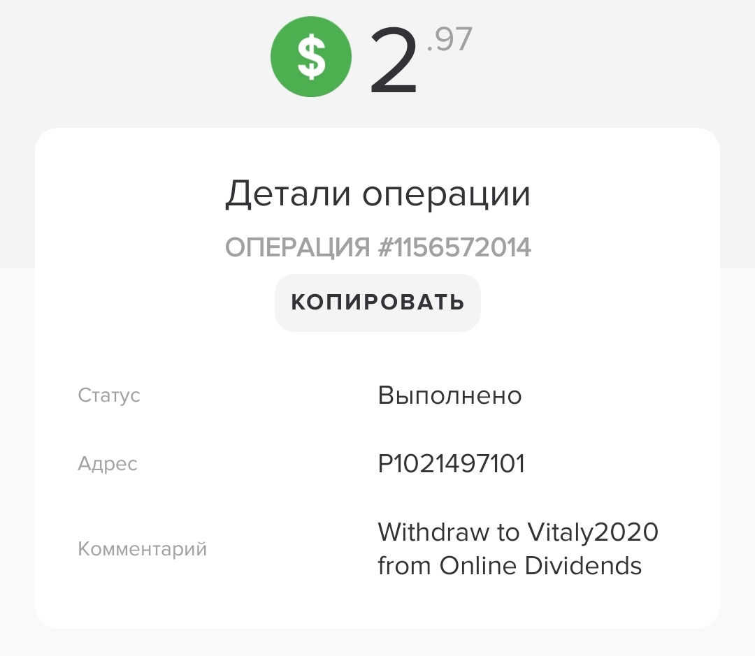 The amount of 0.1 USD has been deposited to your account. Accounts: U21921555->U20. Memo: API Payment. Withdraw from Online Dividends.. Date: 04:15 22.09.20. Batch: 335611520.