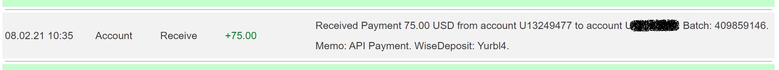08.02.21 10:35 Account Receive +75.00 Received Payment 75.00 USD from account U13249477. Batch: 409859146. Memo: API Payment. WiseDeposit: Yurbl4.