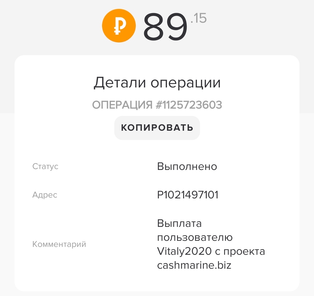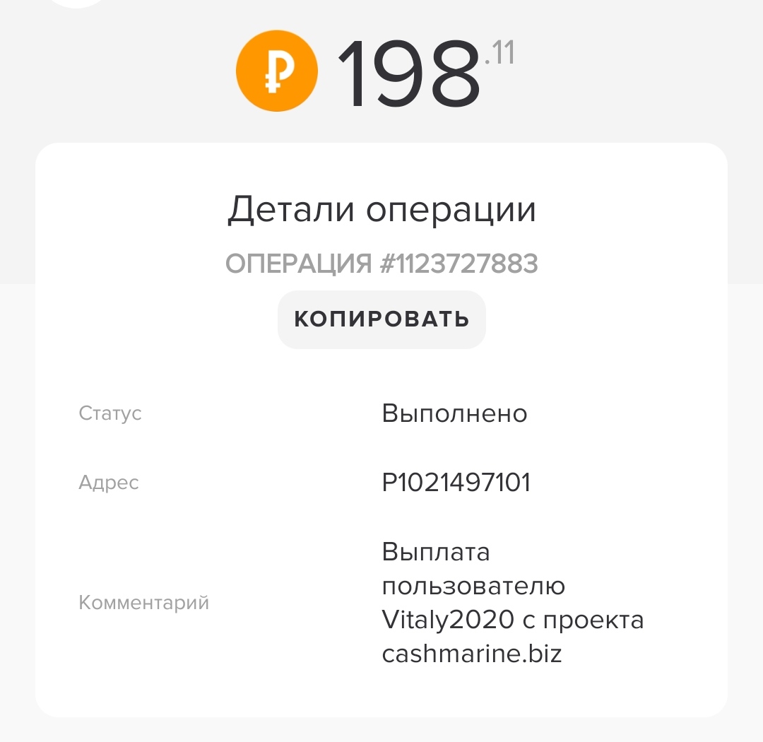 Comment: Amount: 34.99 RUB Выплата с проекта cashmarine.biz