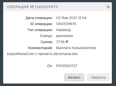Комментарий: Выплата пользователю Yurich с проекта alicemania site.