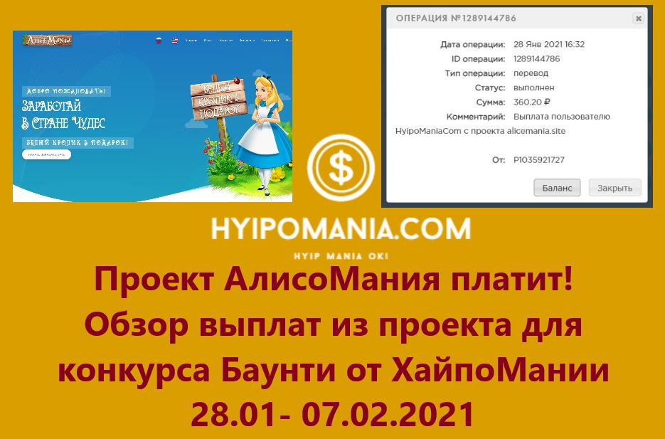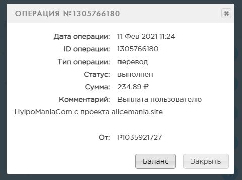 Комментарий: Выплата пользователю Evgeny80 с проекта alicemania.site