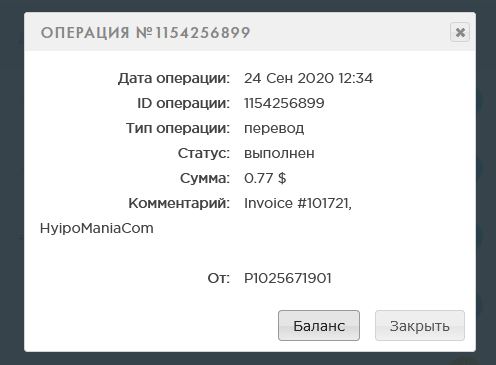The amount of 0.26 USD has been deposited to your account. Accounts: U21015095->U20. Memo: API Payment. Invoice 100043.. Date: 15:58 23.09.20. Batch: 335904908.