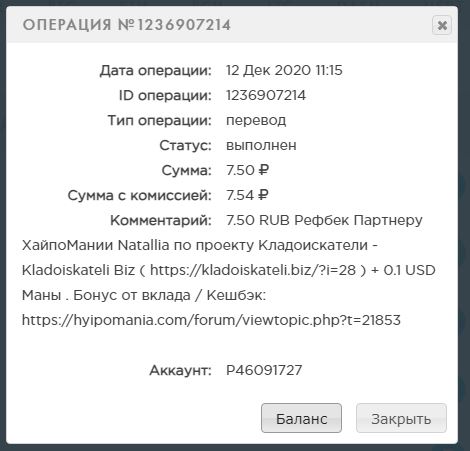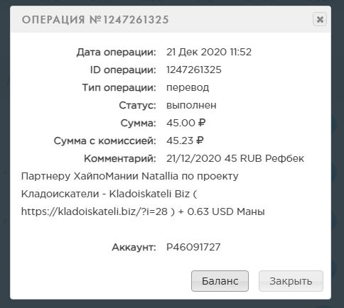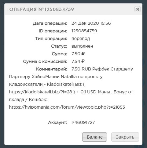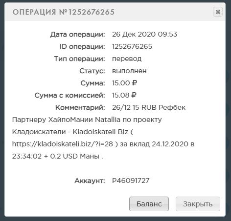 21/12/2020 45 RUB Рефбек Партнеру ХайпоМании Natallia по проекту Кладоискатели - Kladoiskateli Biz ( https://kladoiskateli.biz/?i=28 ) + 0.63 USD Маны