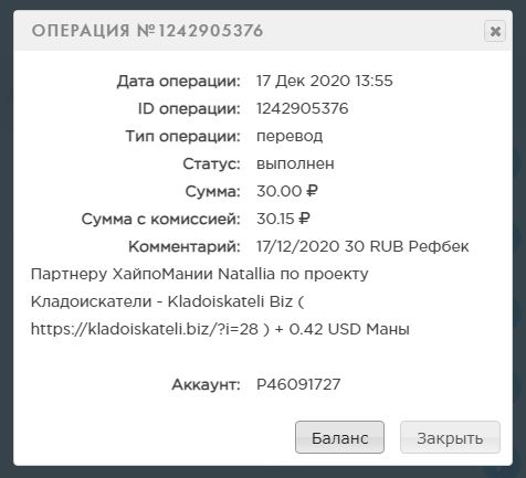 17/12/2020 30 RUB Рефбек Партнеру ХайпоМании Natallia по проекту Кладоискатели - Kladoiskateli Biz ( https://kladoiskateli.biz/?i=28 ) + 0.42 USD Маны