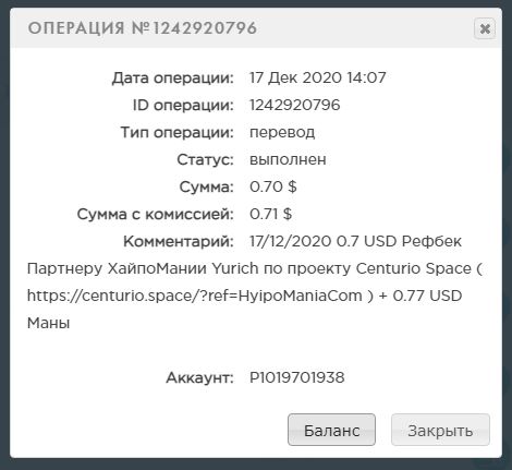 17/12/2020 0.7 USD Рефбек Партнеру ХайпоМании Yurich по проекту Centurio Space ( https://centurio.space/?ref=HyipoManiaCom ) + 0.77 USD Маны