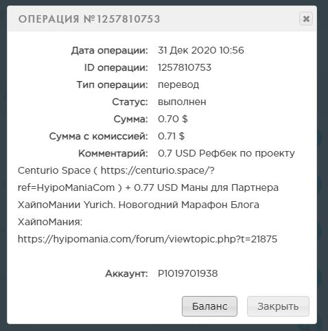 31.12 0.7 USD Рефбек по проекту Centurio Space ( https://centurio.space/?ref=HyipoManiaCom ) + 0.77 USD Маны для Партнера ХайпоМании Yurich. Новогодний Марафон Блога ХайпоМания: viewtopic.php?t=21875