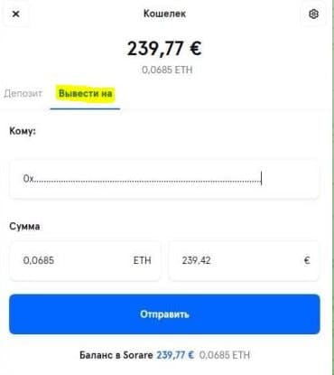 Проще простого: делаем аккаунт на бирже Бинанс / Binance ( https://www.binance.com/ru/register?ref=J2FX6MQK ) , проходим верификацию и теперь можем без комиссии обменивать криптовалюту на фиатные деньги путем p2p обмена. На бирже находим адрес своего ETH кошелька. В самом Сораре ( Специальная партнерская ссылка для получения бонусной лимитированной карты за 5 первых покупок на аукционе : http://sorare.com/r/hyipomaniacom-1-rar ... es-welcome ) мы находим свой внутренний кошелек в правом верхнем углу кабинета и там - вкладку "Вывести на" - вводим туда адрес из биржи - пишем сумму которую выводим - кнопка "отправить". Подтверждаем вывод, кликая по ссылке, которая придёт нам