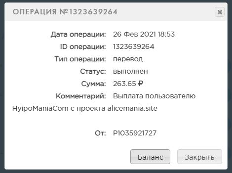 Комментарий: Выплата пользователю Evgeny80 с проекта alicemania.site
