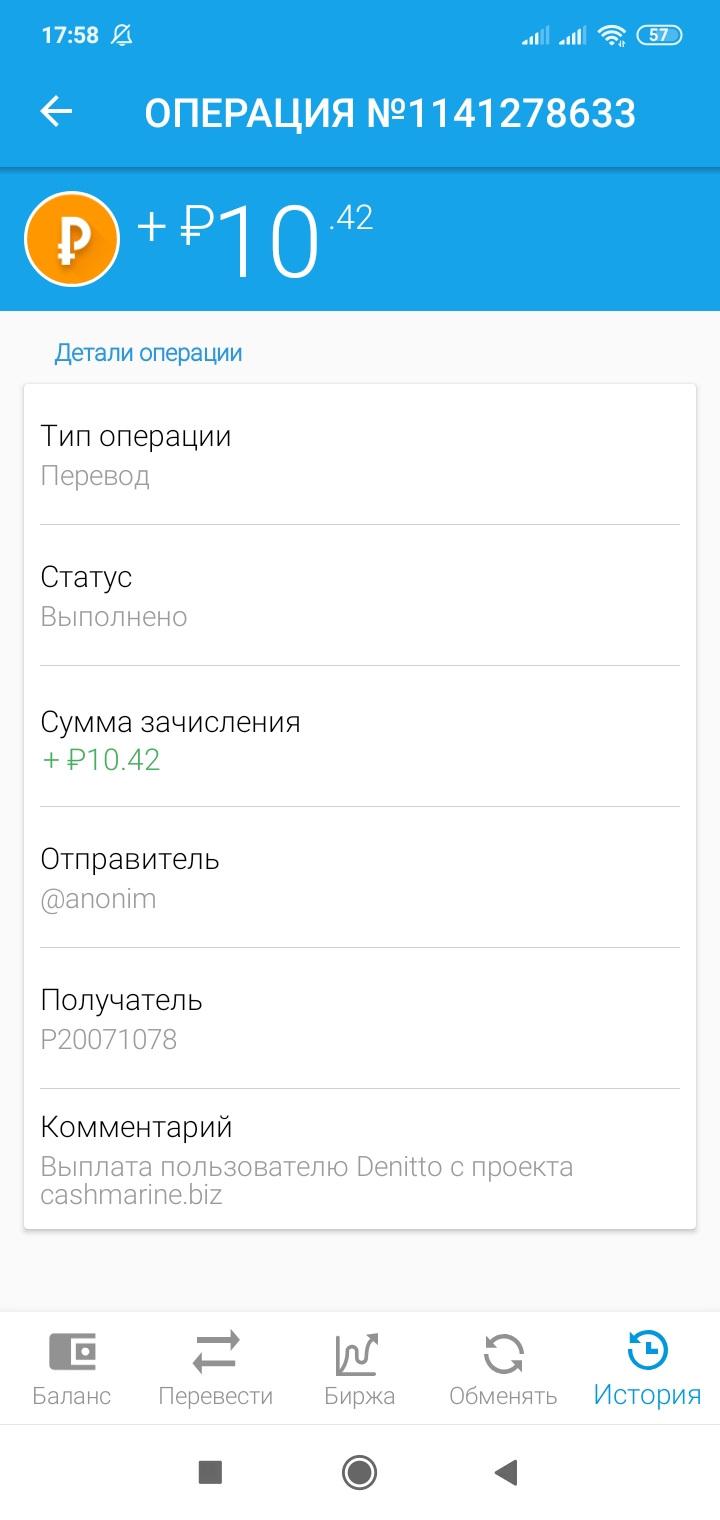 Comment: Amount: 85.01 RUB Выплата с проекта cashmarine.biz