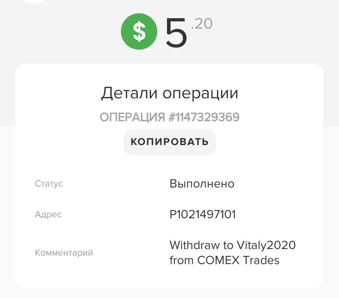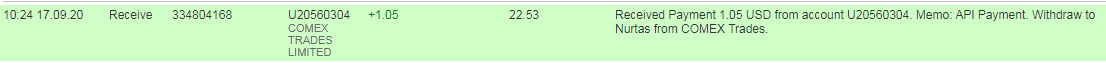 The amount of 1.05 USD has been deposited to your account. Accounts: U20560304->U190. Memo: API Payment. Withdraw from COMEX Trades.. Date: 10:14 18.09.20. Batch: 334974661.