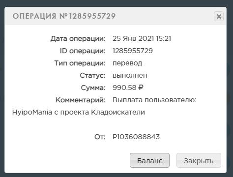 Комментарий: Выплата пользователю: raakot с проекта Кладоискатели