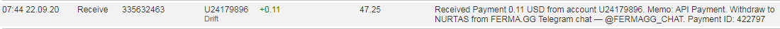 Drift +0.56 115.7 Received Payment 0.56 USD from account U24179896. Memo: API Payment. Withdraw to COVBOI from FERMA.GG Telegram chat — @FERMAGG_CHAT. Payment ID: 404020