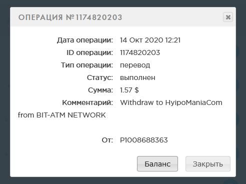 The amount of 1.5 USD has been deposited to your account. Accounts: U23031321->U26. Memo: API Payment. Withdraw from BIT-ATM NETWORK.. Date: 14:24 06.10.20. Batch: 338672263.