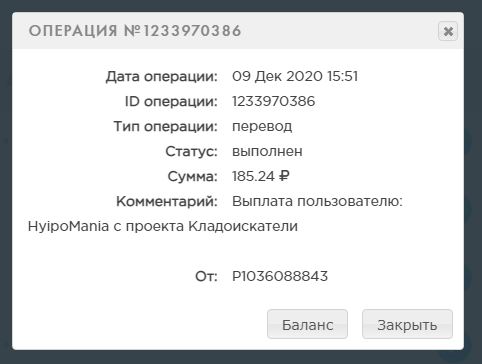 Комментарий: Выплата пользователю: raakot с проекта Кладоискатели