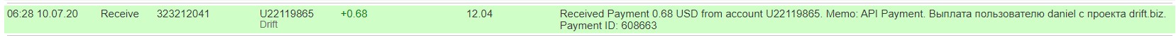 Drift +0.68 39.87 Received Payment 0.68 USD from account U22119865. Memo: API Payment. Выплата пользователю daniel с проекта drift.biz. Payment ID: 641195