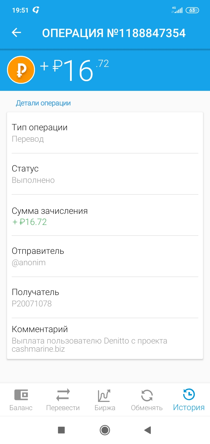 Комментарий: Выплата пользователю SmirnoFF с проекта cashmarine.biz