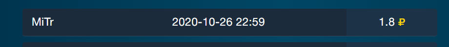 Дата: 28 Окт 2020 08:33 ID: 1190380915 Тип: перевод Статус: выполнен Сумма: 198.11