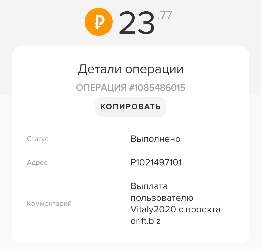 Payment Received + 54.48 RUB Date: 18.07.2020 11:00:12 (UTC+3) ID: 1086497997 Details: anonim → P46 Comment: Amount: 54.48 RUB Выплата с проекта drift.biz