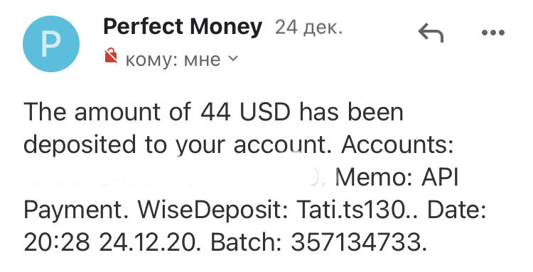 The amount of 11.71 USD has been deposited to your account. Accounts: U13249477->U16410***. Memo: API Payment. WiseDeposit: *******. Date: 22:26 26.12.20. Batch: 357465935.