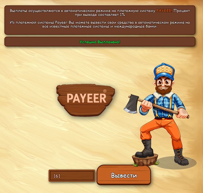 Игра оформлена по интересному дизайну, в ней вам нужно приобретать лесорубов которые будут рубить дрова и приносить вам прибыль. После регистрации вы получите лесоруба Чико в подарок, чем больше персонажей вы купите тем больше будет ваш доход.