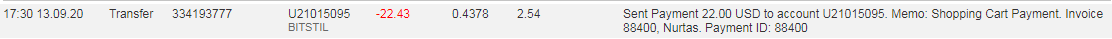 The amount of 0.26 USD has been deposited to your account. Accounts: U21015095->U20. Memo: API Payment. Invoice 90153.. Date: 11:35 17.09.20. Batch: 334817055.