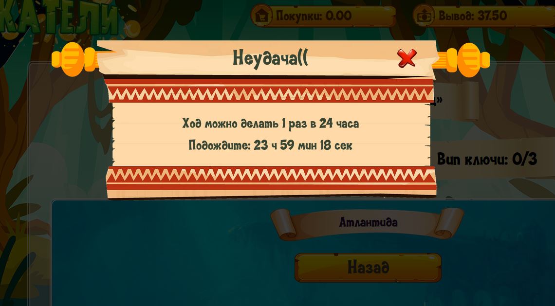 Путь юного кладоискателя начинается с локации Атлантида. Чтобы начать зарабатывать нужно оплатить вход. После оплаты открываются поля, в которых спрятаны деньги. Один раз в день у тебя есть возможность открыть одно поле. Вперед за сокровищами!