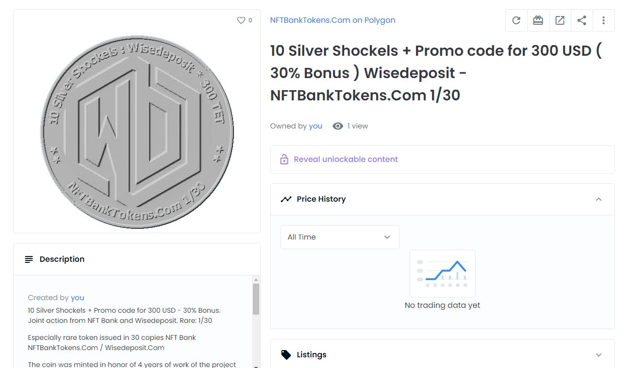 Part of the collection on the Polygon ( Matic ) blockchain: https://opensea.io/collection/nftbanktokens-com